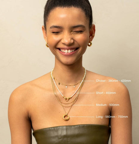 Our chains and necklaces fall within four lengths. Some designs are adjustable, with extender links that can be used to fasten in multiple positions to create shortened or longer chains for your ultimate neckmess.